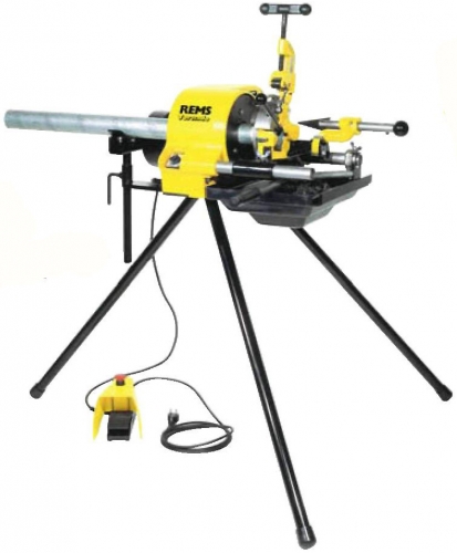 Станок REMS Торнадо для нарезания трубной резьбы (1/16") 1/8" – 2", 16 – 63 мм, болтовой резьбы (6) 10 – 60 мм, 1/4" – 2". Не требующий технического обслуживания редуктор, педаль включения с защитой, 2 автоматических зажимных патрона, автоматическое охлаждение и смазка. С комплектом инструмента, состоящим из универсальной автоматической резьбонарезной головки для всех видов, в том числе длинной резьбы, автоматически открывающейся после нарезания заданной конической резьбы, гребенок для конической трубной резьбы ISO 7-1, DIN EN 10226 (DIN 2999, BSPT) R 1/2" – 3/4" и R 1" – 2" правая, трубореза, гратоснимателя. 3 двигателя на выбор. Переносной вариант на трёх ножках, со снимающейся большой масляной ванной и поддоном для стружки. Вариант Т со встроенной увеличенной масляной ванной и поддоном для стружки для разменщения на верстаке, стойке или передвижной тележке с подставкой для труб.