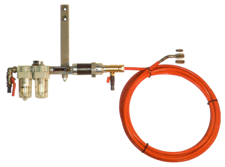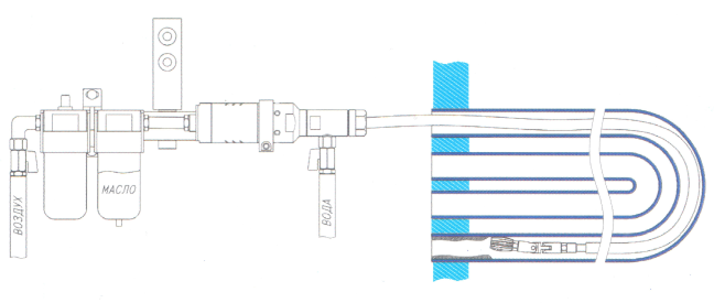 Пневматический привод через гибкий вал передает крутящий момент на чистящий элемент (шарошку). Шарошка с гибким валом в рубашке (из трубки ПВХ) подается внутрь трубы. Для повышения эффективности очистки через рубашку гибкого вала в зону очистки подается вода. Для обеспечения нормальной работы пневмодвигателя устройство укомплектовано блоком подготовки воздуха, который фильтрует, сепарирует воздух и подает необходимое количество масла в пневмодвигатель. Шаровой кран служит для включения и выключения пневмодвигателя и регулирования его оборотов в процессе работы.