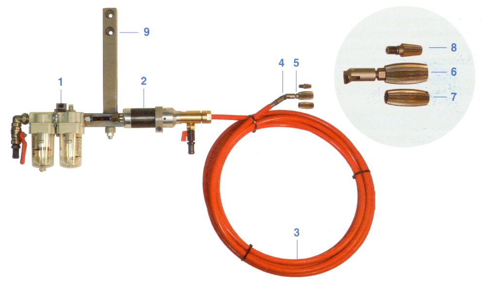 Устройство СТОК-38 комплектуется: блоком подготовки воздуха (поз. 1), двигателем пневматическим (поз. 2), гибким валом в сборе длиной 8 м. (поз. 3), карданом (поз. 4), переходником (поз. 5), шарошкой Ø 25 мм (поз. 6), шарошкой Ø 20 мм (поз. 7), шарошкой конической 15 мм. (поз.8), рамой (поз.9).